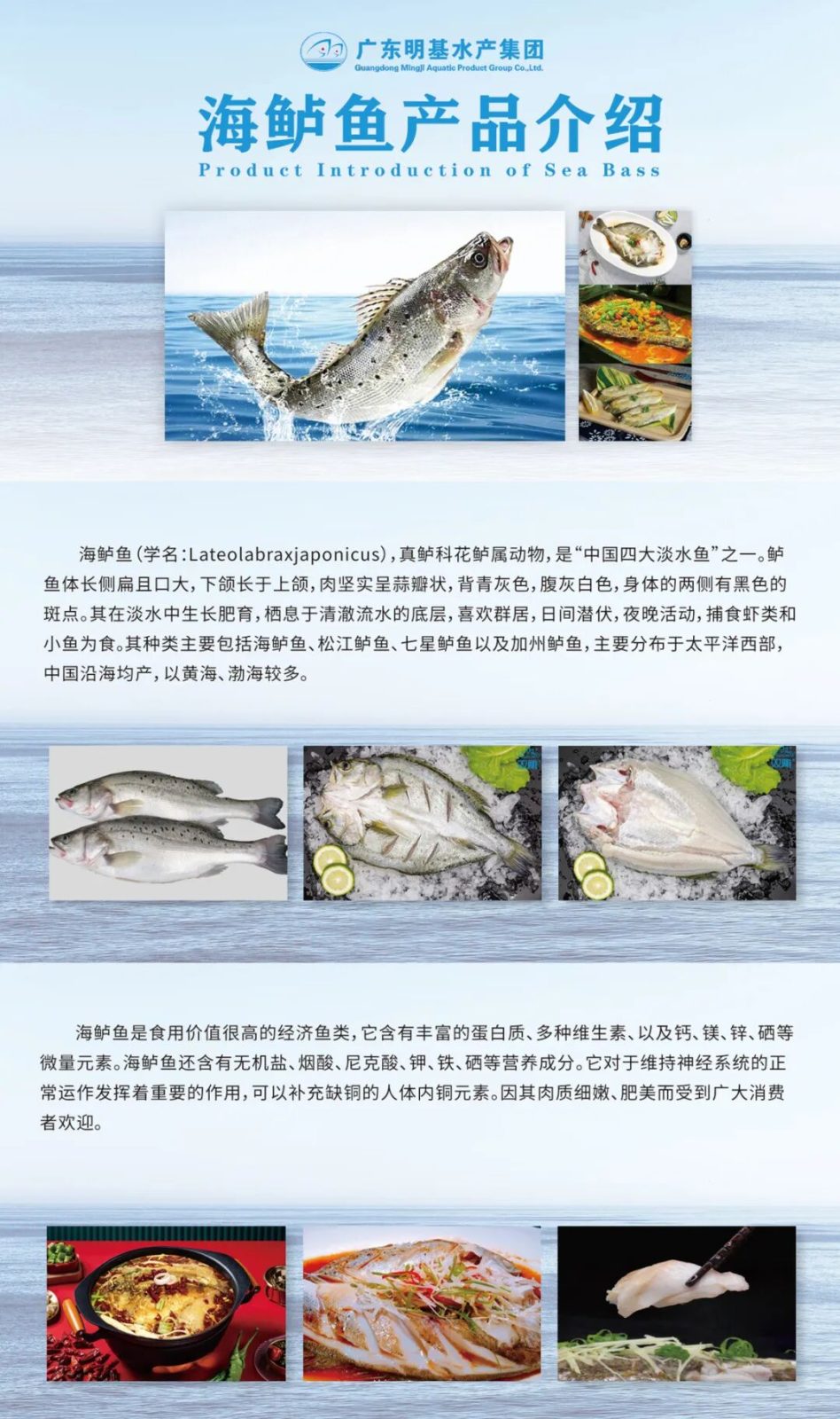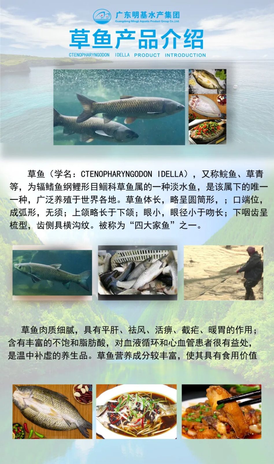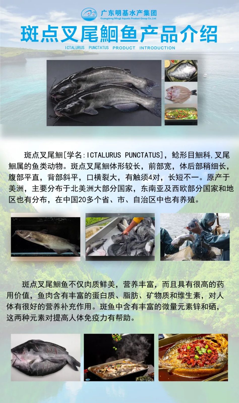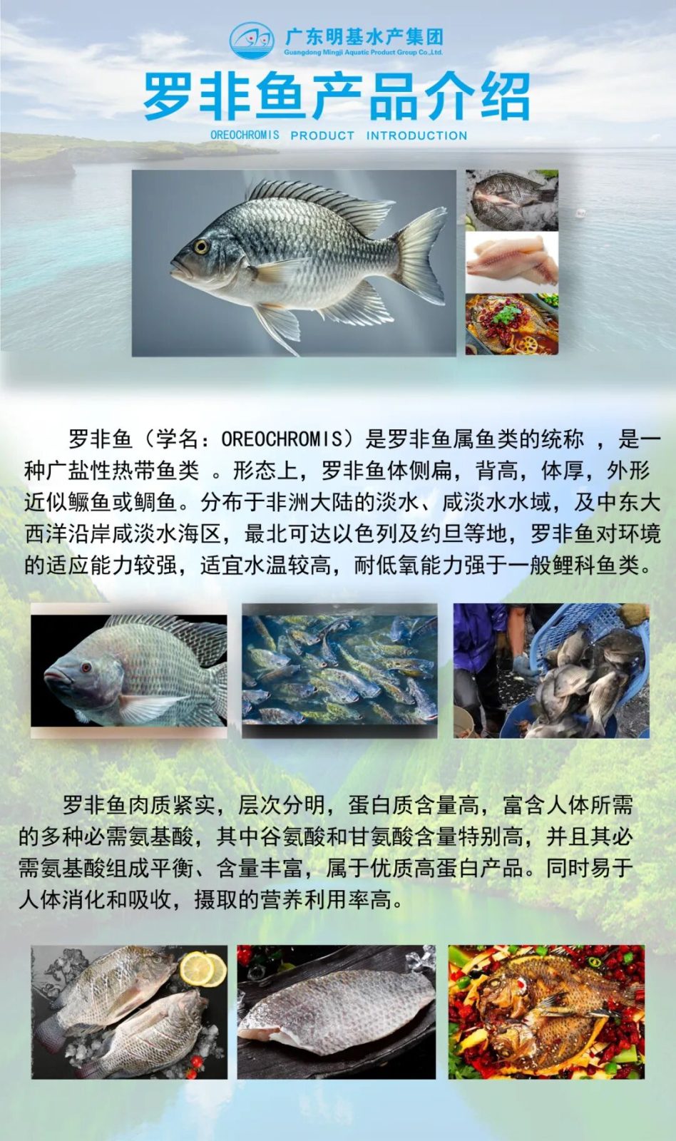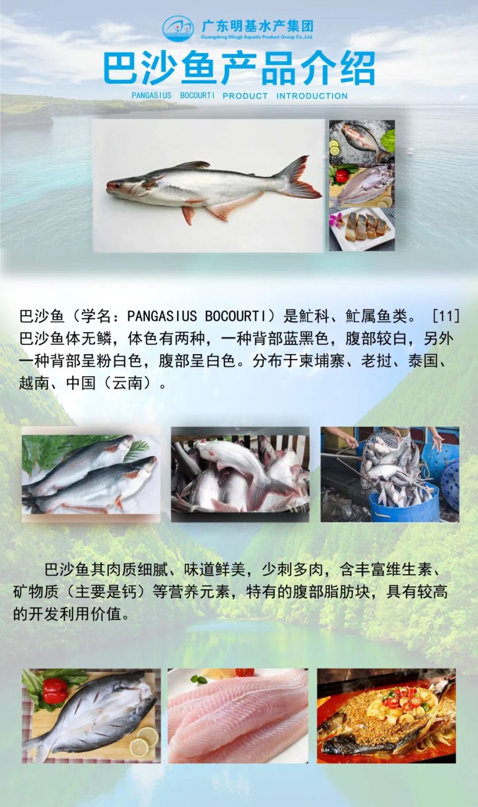 广东明基水产集团有限公司创立于2006年3月,总部位于广东省云浮市新兴县,紧靠省道,交通便利。集团现已发展成为一家专业从事鱼类养殖、水产品加工、贸易销售、冷链仓储、供应配送服务一体化的集团公司,辖下有乐润基,明基养殖,朝鱼儿和渔有爱4个子公司,拥有双、皮皮侠、爽味渔、渔米哒、渔王舱5个子品牌。集团总部占地面积50000平方米,厂房办公面积10000多平方米,拥有各类专业技术及生产人员650多人,数万亩水产养殖基地和大型加工厂房,配有国际先进的生产技术和设备。明基水产集团有限公司是国家级农业产业化龙头企业,通过了国家出入境检验检疫局出口食品卫生认证,先后取得了中国国家认证认可的输美HACCP认证、欧盟认证、国际水产联盟BAP认证、英国零售商式会BRC认证等,公司“双雕”品牌已成为行业标杆。公司注册出口的水产品有罗非鱼、鲮鱼、鲈鱼、红鼓鱼、金鲳鱼等,制作有带皮鱼片、中深去皮鱼片、调味鱼片和面包鱼片等品种,畅销欧美国家及RCEP(区域全面经济伙伴关系协定)等二十多个国家和地区。国内销售的产品有烤鱼系列的开背罗非鱼、斑点叉尾鮰、海鲈鱼、长吻、草鱼、巴沙鱼、游龙斑、鲟龙鱼等。